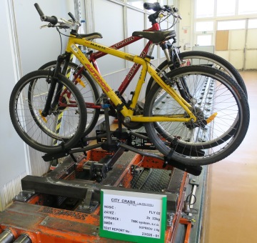 Pravidelně také nosiče kol testujeme fyzicky - to znamená naložit 60 kg a odjezdit tisíce kilometrů. Na lokálních silnicích jezdíme 90 km/h, na dálnicích 130 km/h. Metodiku jsme převzali ze Škoda Auto.